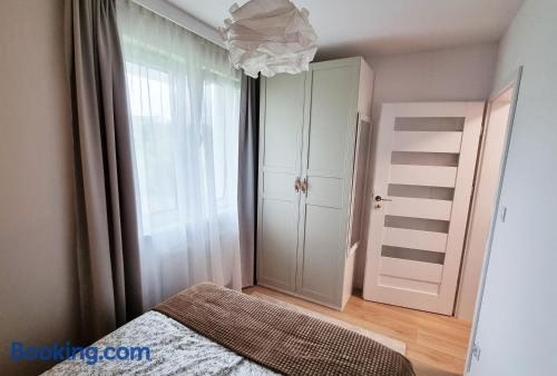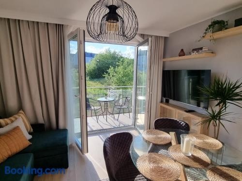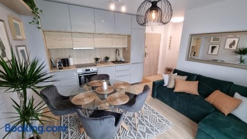 Modern Sustainable Accommodation in GdańskConvenient Amenities: Enjoy free parking, strong WiFi, and easy airport access at Apartament Młody Gdańsk.Comfortable Living: Relax in a stylish apartment with a fully equipped kitchen, streaming services, and a charming balcony with garden views.Family-Friendly Environment: Kids can have fun at the playground while guests appreciate the allergy-free and non-smoking atmosphere.Experience a delightful stay near key attractions like Long Market and Main Town Hall. Book your eco-friendly retreat now at Apartament Młody Gdańsk for a memorable Gdańsk getaway.